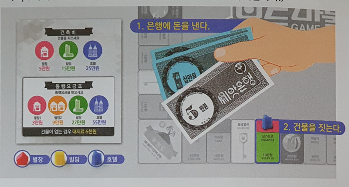 후반전을 시작하면 자기가 갖고 잇는 증서에 적힌 금액대로 돈을 은행에 지불하고 별장이나 빌딩, 호텔을 짓습니다.