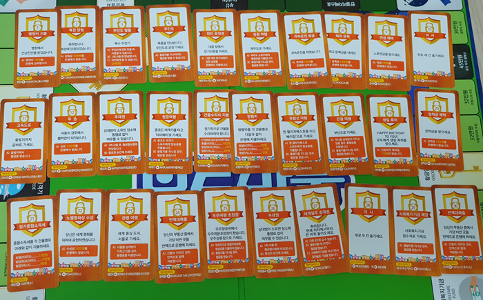 황금열쇠카드는 위에서 뽑아가는 방식으로 진행해도 되고, 마음에 드는 카드를 뽑아가도 됩니다. 부루마블 게임을 진행하기 전에 황금열쇠 카드 뽑는 룰을 정확히 정해놓고 진행하면 됩니다.