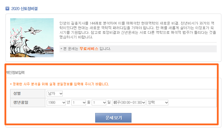 2020 신토정비결입니다. 성별과 생년월일 시간을 넣으면 토정비결을 볼 수 있습니다.