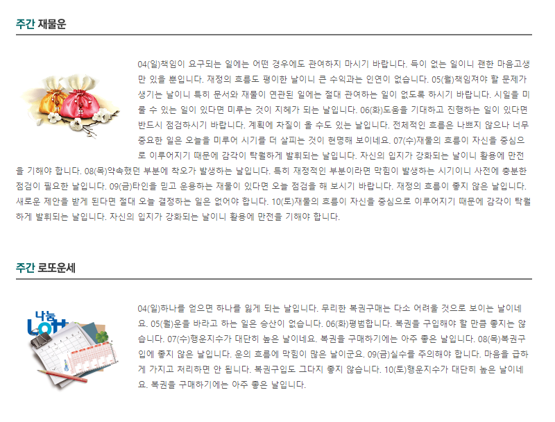 총론부터 재물운, 직장/ 사업운, 가족 및 가정운, 이성 및 대인관계, 월별세운이 제공이 됩니다.