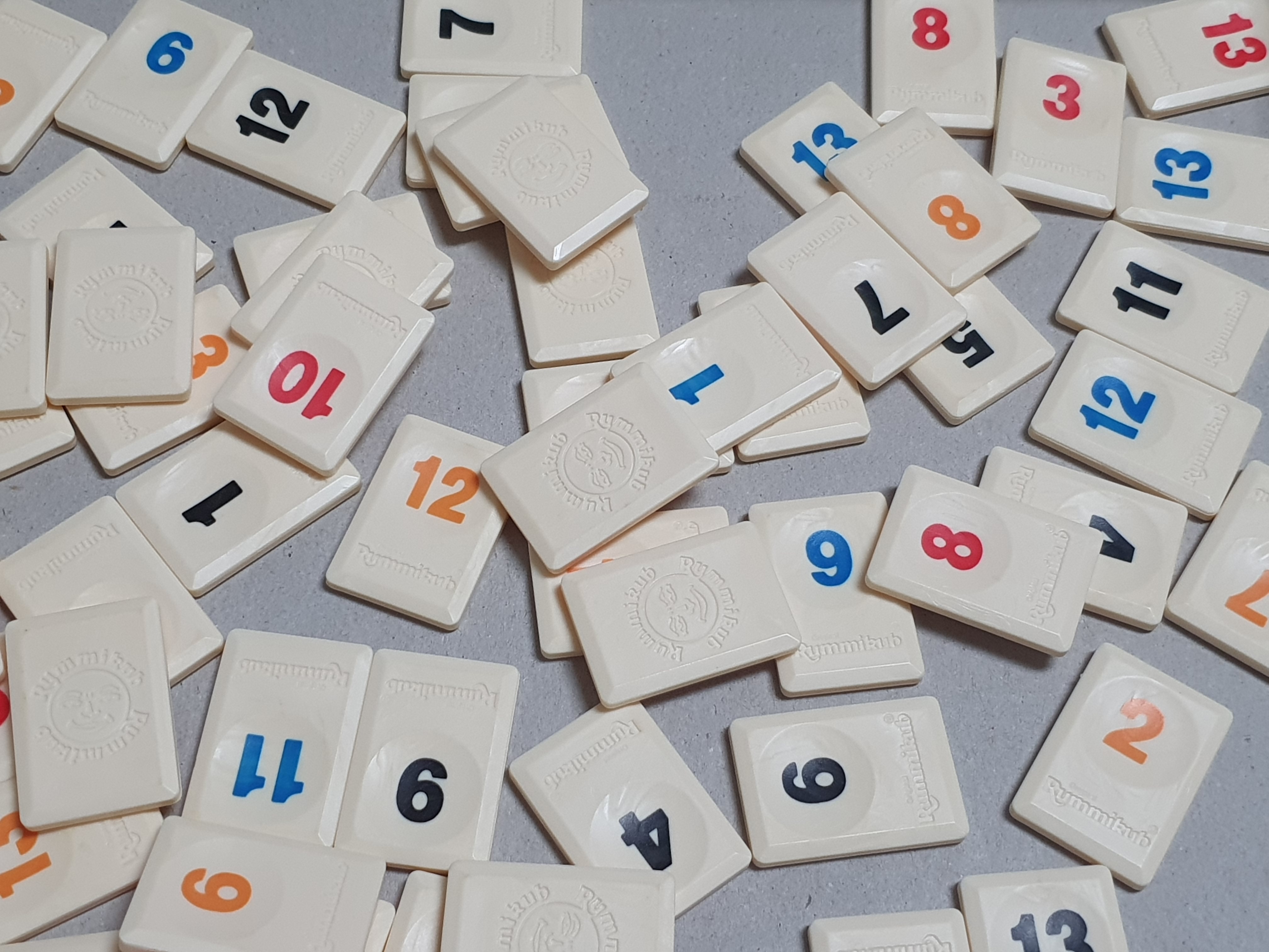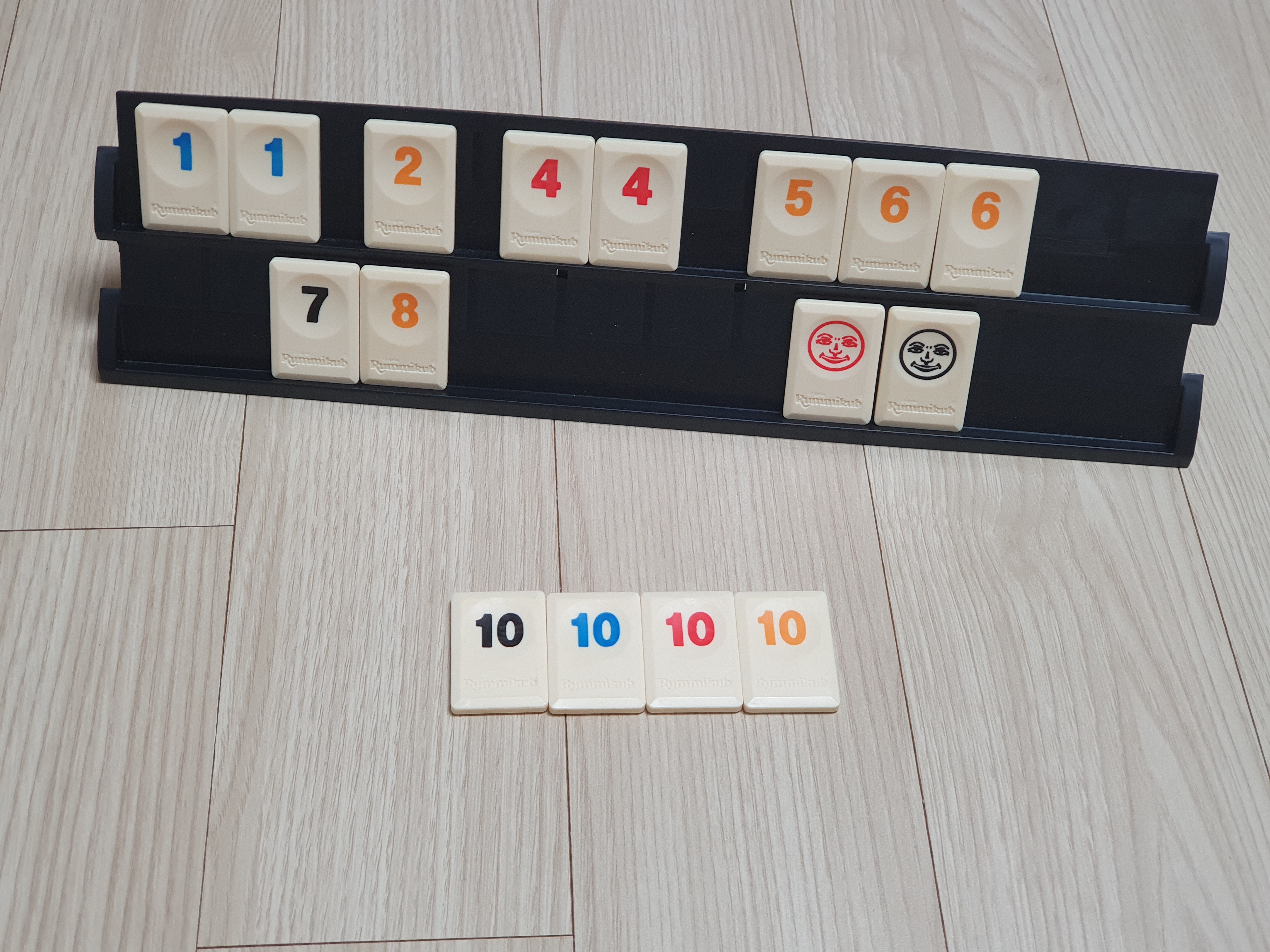 루미큐브는 1~13까지의 네 가지 색 숫자타일 104개와 조커 2개로 총 106개의 타일로 이루어져 있습니다.