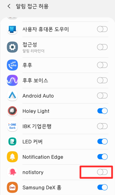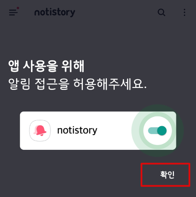 ▲ 알림 접근 허용에 노티스토리 앱이 비활성화가 되어있을 것입니다. 활성화로 체크를 해주시면 됩니다.