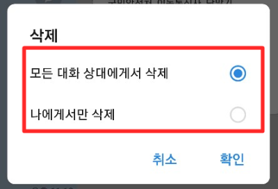 ▲ 이번 화면에서 <모든 대화 상대에게서 삭제>를 선택해야 상대방 카카오톡 메세지도 삭제가 됩니다.