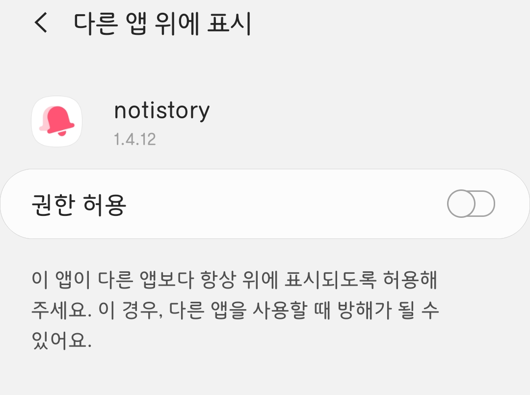 ▲ 다른 앱 위에 표시 권한 허용을 활성화시켜주면 됩니다.