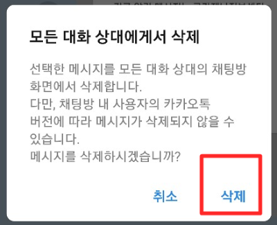 ▲ "모든 대화 상대에게서 삭제" 다시 한번 확인을 위해서 <삭제>를 클릭해줍니다.