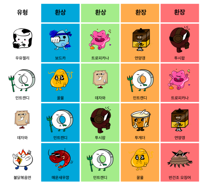 ▲ SPTI 우유젤리, 민트캔디, 데자와, 불닭볶음면의 환상, 환장의 케미입니다.