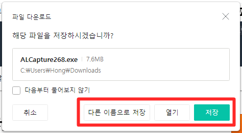 ▲ 알캡쳐 다운로드 용량은 7.6MB로 5초 이내에 다운로드됩니다. 다른 이름으로 저장, 열기, 저장의 버튼을 이용해서 다운로드합니다.