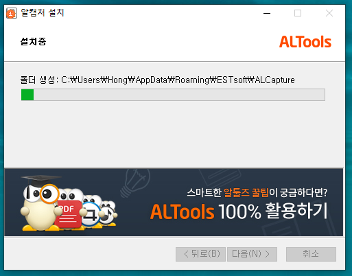 ▲ 설치가 진행됩니다. 10초 정도 걸리는 듯합니다. 알캡쳐 설치가 완료가 되어 <확인>을 클릭하면 됩니다.