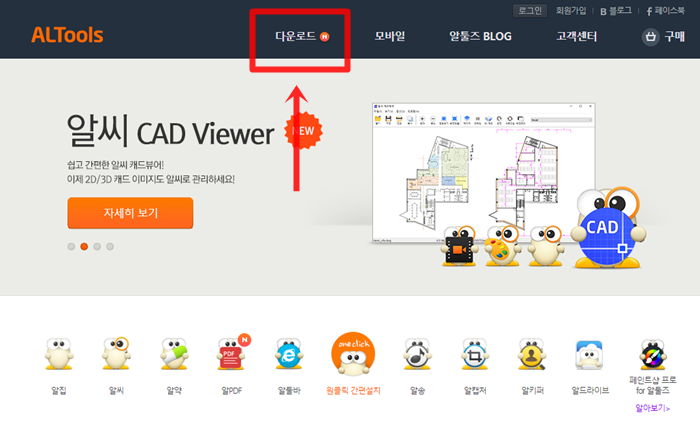 ▲ 알툴즈 공식 홈페이지 접속화면입니다. 상단 메뉴들 중에서 <다운로드>를 클릭해줍니다.