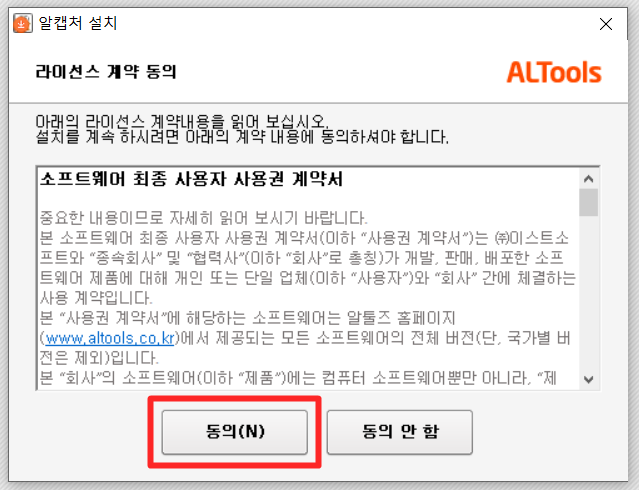 ▲ 알캡쳐 설치 시작 단계로 라이선스 계약 동의에 <동의>를 선택하셔서 설치가 진행이 됩니다.