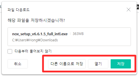 ▲ 녹스 앱플레이어 다운로드 파일은 363MB이며, 열기나 저장을 클릭해서 다운로드하여줍니다.
