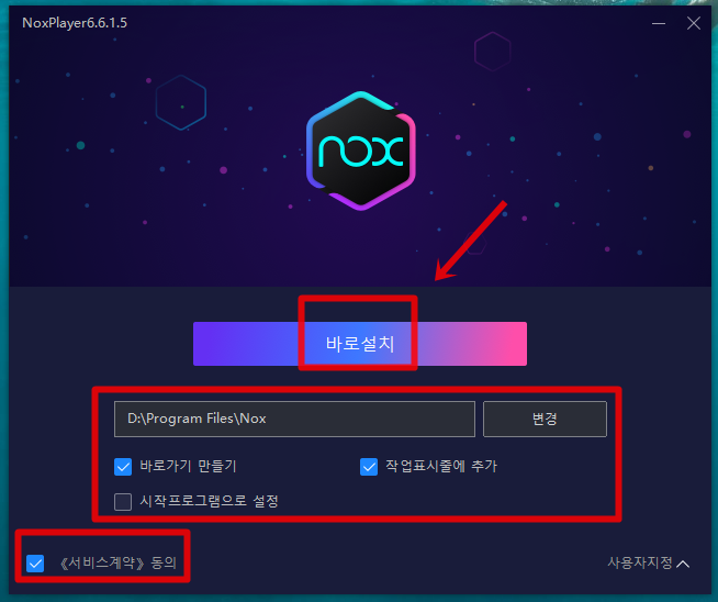▲사용자 지정을 클릭하면 녹스 설치 위치를 선택할 수 있습니다. 또한, 바로가기 만들기, 작업표시줄에 추가, 시작프로그램으로 설정을 원하는 데로 선택하시면 됩니다.