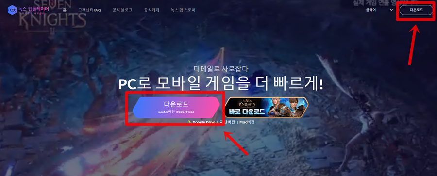▲ 녹스 앱플레이어 공식 홈페이지입니다. 녹스 앱플레이어 다운로드는 화면 가운데 다운로드 버튼이나 우측 상단에 다운로드 버튼을 클릭해줍니다.